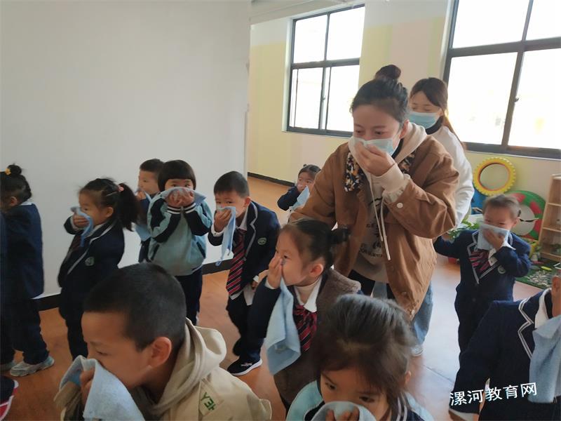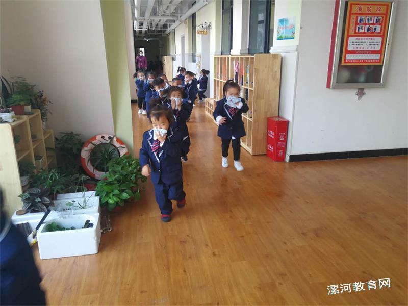演练过程中幼儿用湿毛巾捂住口鼻并弯腰逃生