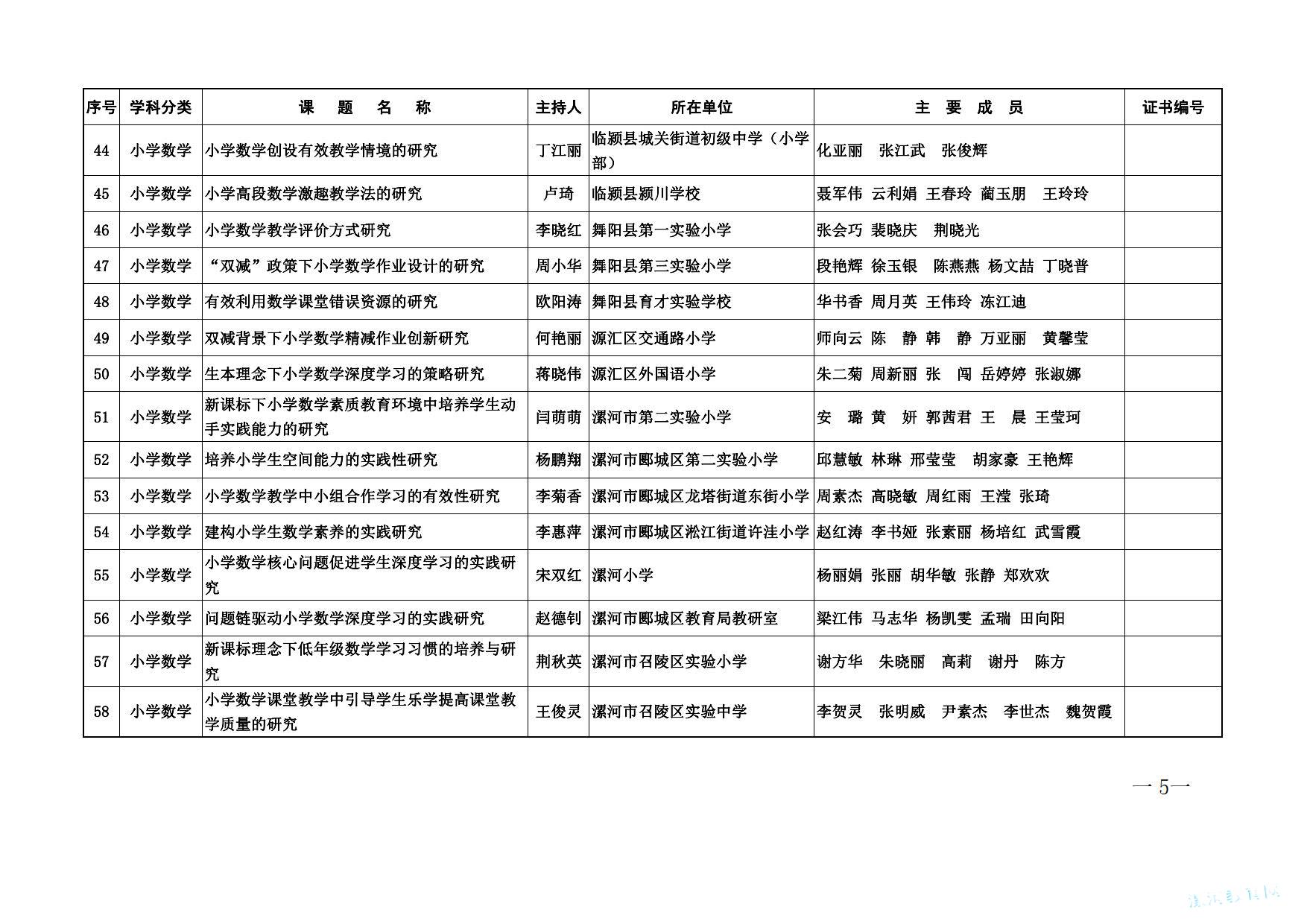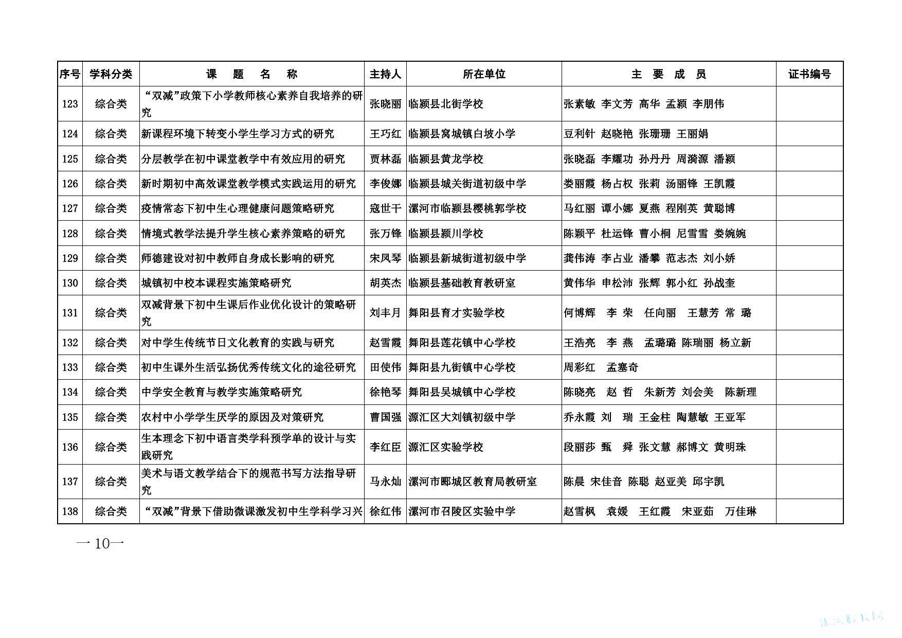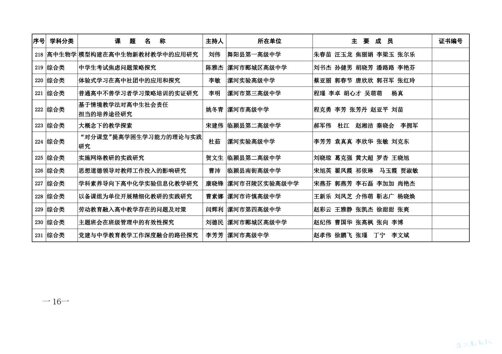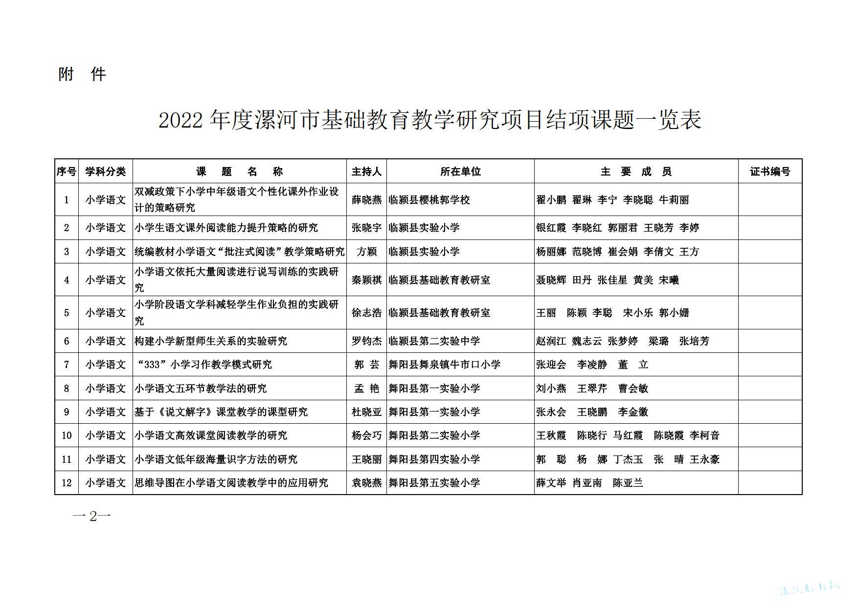 依据《漯河市教育局关于公布2021年度漯河市基础教育教学研究项目立项课题的通知》(漯教基研〔2022〕3号)和《漯河市教育局关于组织2022年度基础教育教学研究项目结项申报工作的通知》的要求,漯河市教育局组织基础教育教学研究项目评审专家对结项申报材料进行了严格核查与鉴定,共231项课题验收合格,批准结项,现将鉴定结果予以公示。