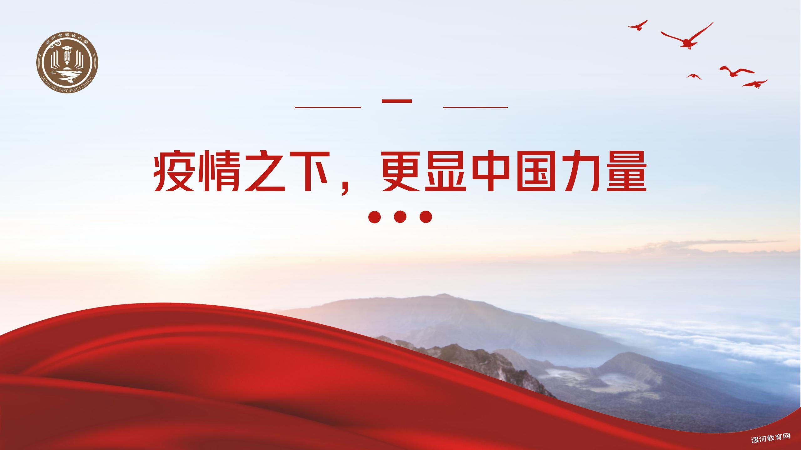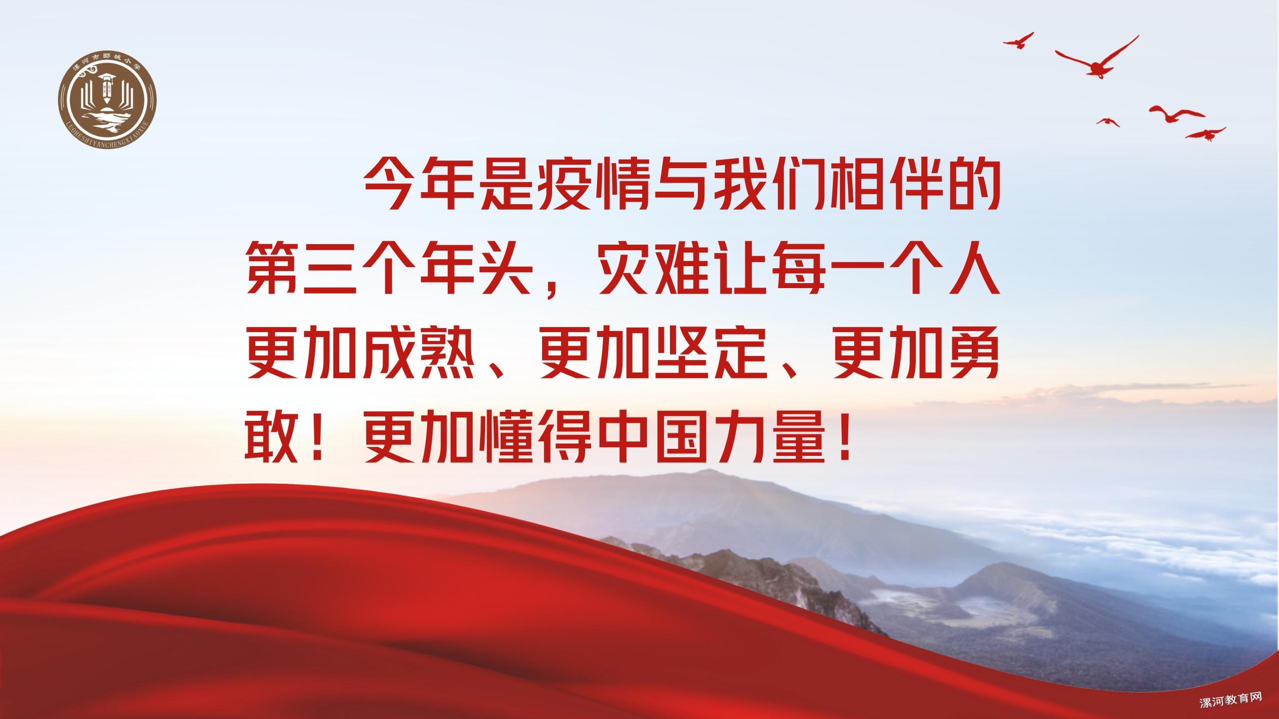 亲爱的老师们、同学们,疫情之下的漯河是和平稳定的,我们是丰衣足食的、健康自由的!即便是疫情封控,我们依然是安宁的。疫情让我们意识到,我们与伟大的祖国、与生活的这座城市唇齿相依,荣辱与共。唯有强大的祖国才能给予我们和平与安宁!