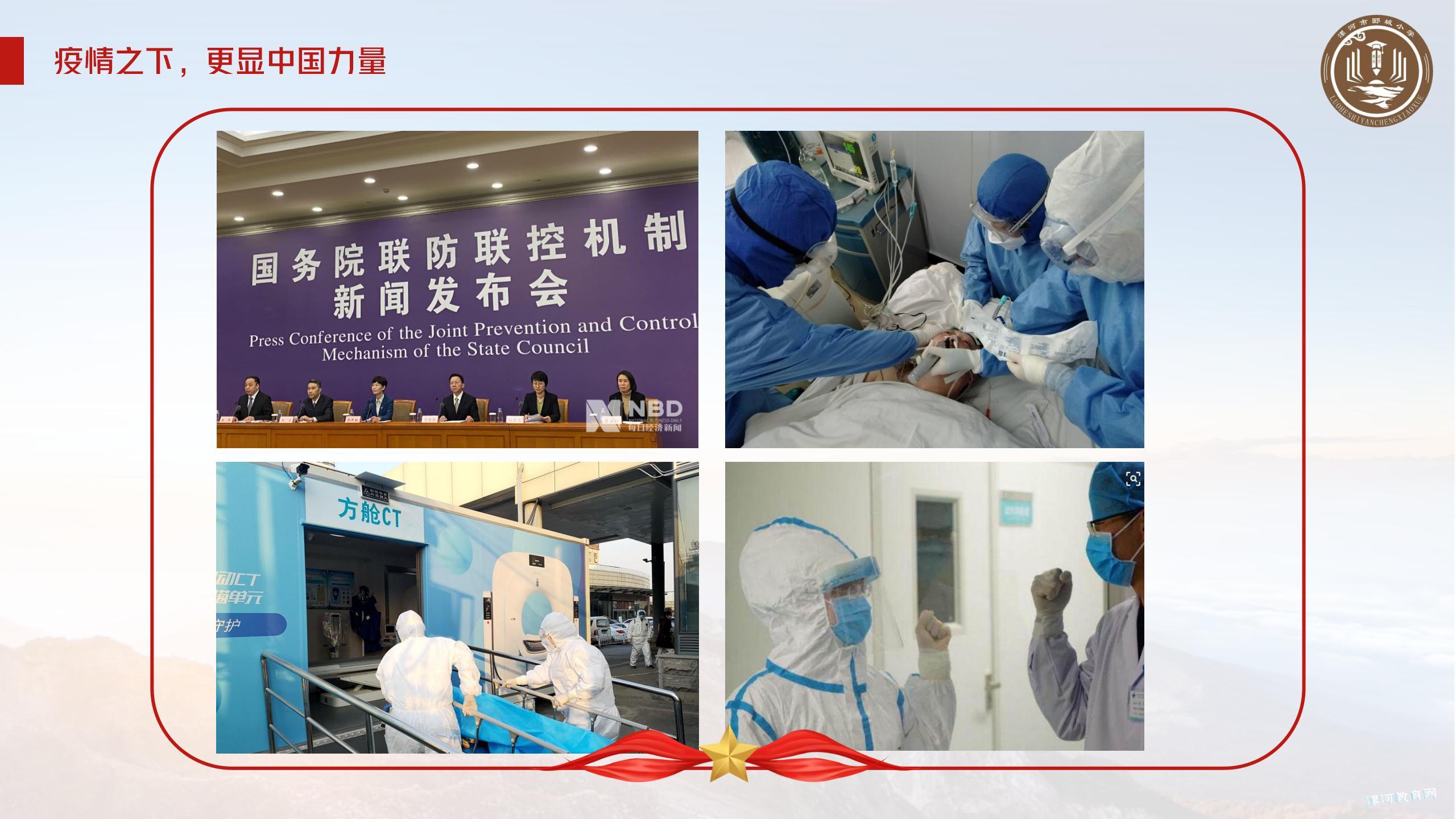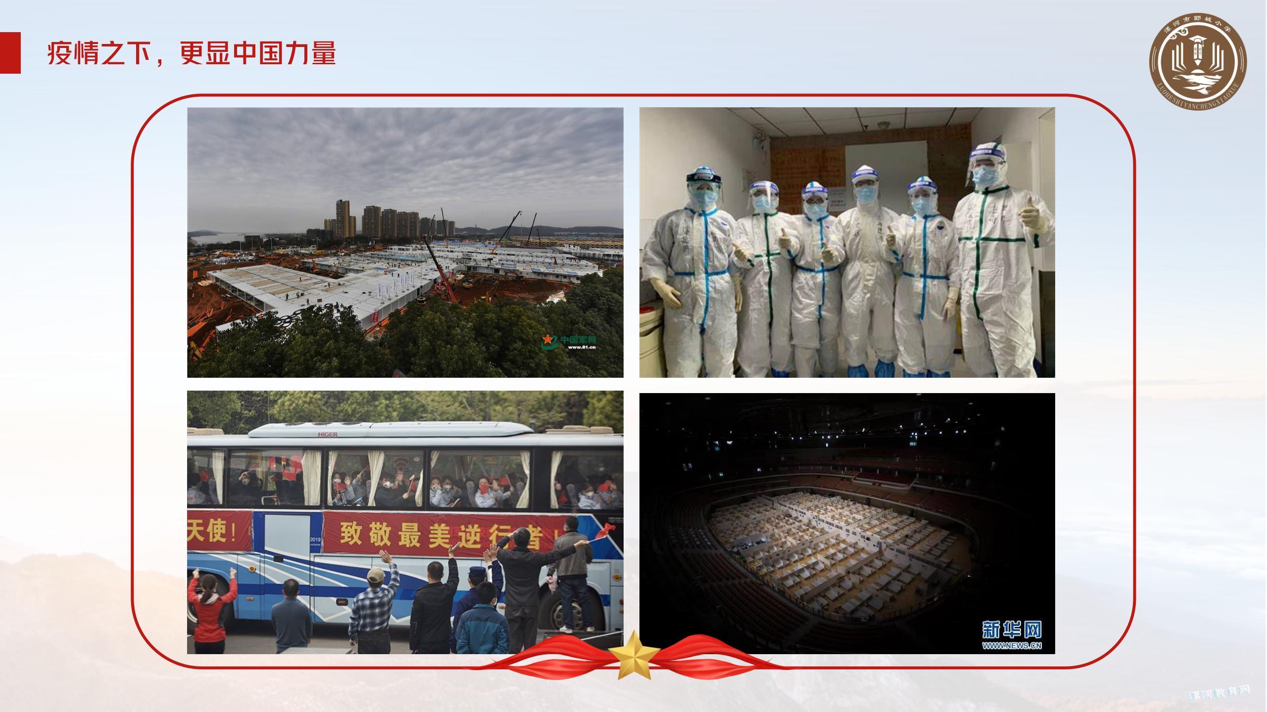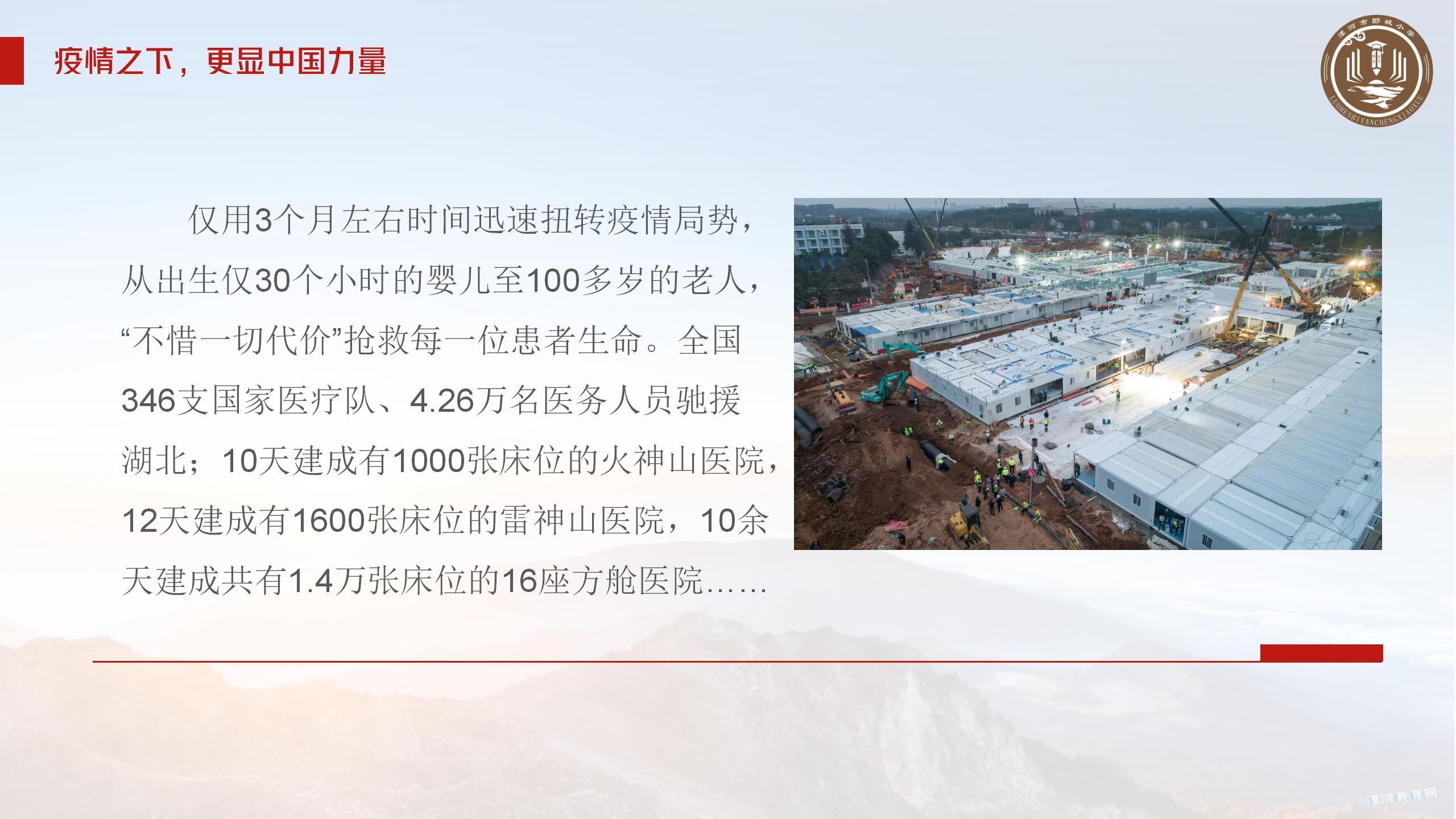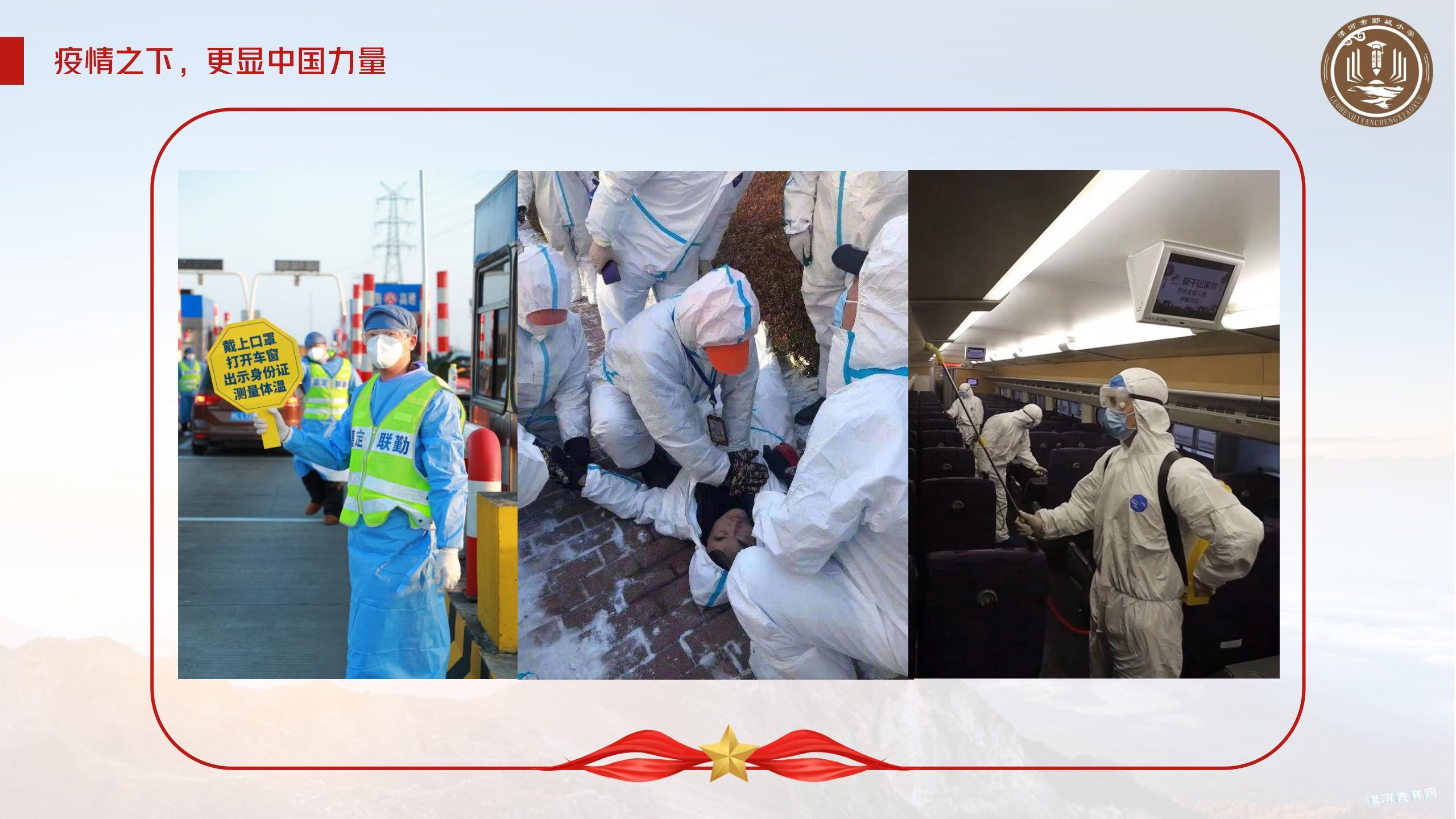 今年是疫情与我们相伴的第三个年头,灾难让每一个人更加成熟、更加坚定、更加勇敢!更加懂得中国力量!疫情暴发初期,中国共产党以非常之举应对非常之事,全国上下积极响应习近平总书记强有力的号召:“人民至上、生命至上”。仅用3个月左右时间迅速扭转疫情局势,从出生仅30个小时的婴儿至100多岁的老人,“不惜一切代价”抢救每一位患者生命。全国346支国家医疗队、4.26万名医务人员驰援湖北;10天建成有1000张床位的火神山医院,12天建成有1600张床位的雷神山医院,10余天建成共有1.4万张床位的16座方舱医院……抗击疫情的事实再次证明,“集中力量办大事”是中国特色社会主义制度优势的突出特征,是我们实现从站起来、富起来到强起来历史性飞跃的强大“中国力量”。