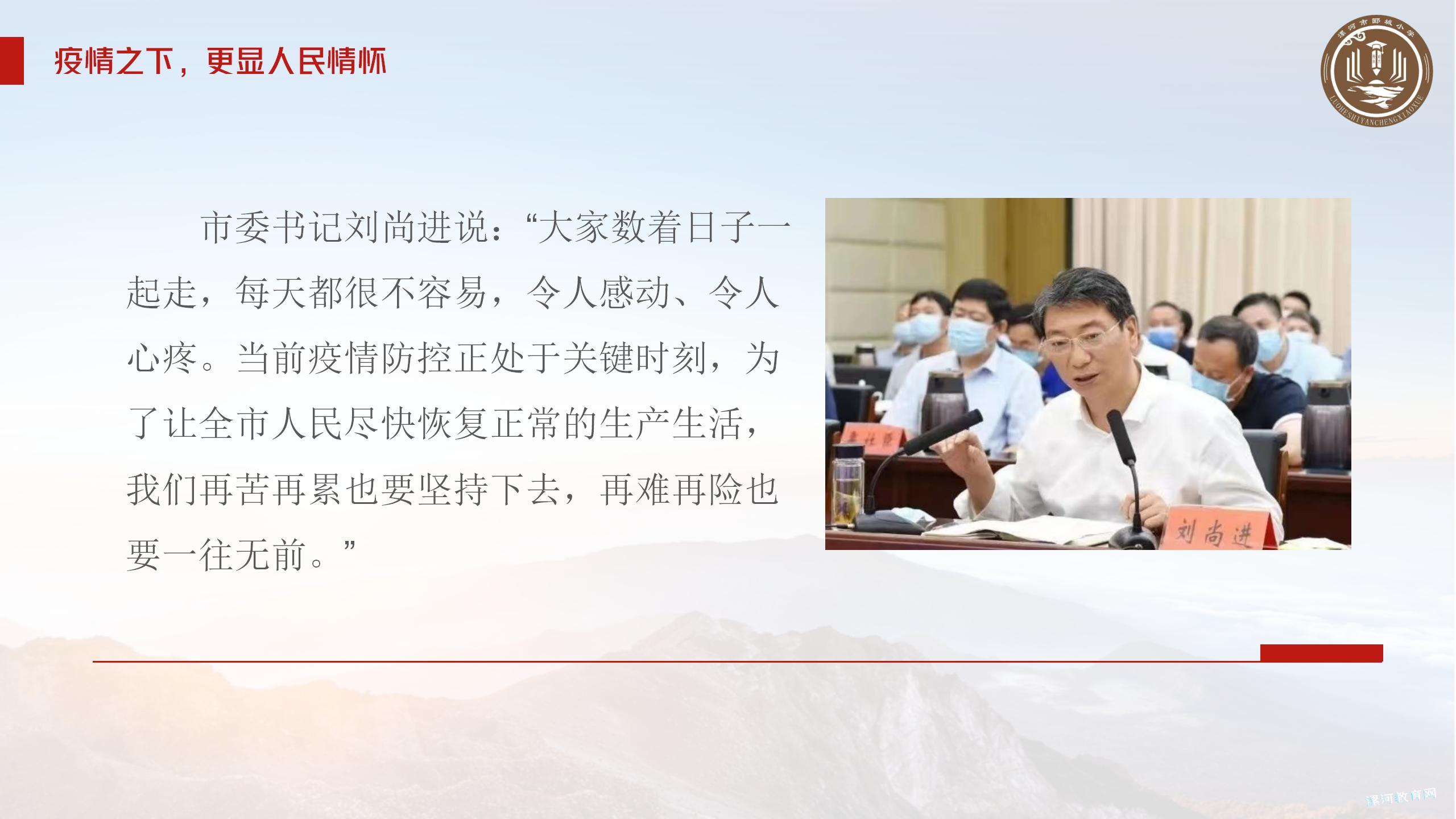市委书记刘尚进说:“大家数着日子一起走,每天都很不容易,令人感动、令人心疼。当前疫情防控正处于关键时刻,为了让全市人民尽快恢复正常的生产生活,我们再苦再累也要坚持下去,再难再险也要一往无前。”市委市政府以全市人民的安危和利益为上,坚强领导阻击疫情,连续数次组织全民核酸检测,以果断措施和雷霆手段迅速遏制了疫情蔓延势头,在危难之时让我们感受到一份安全和温暖。
