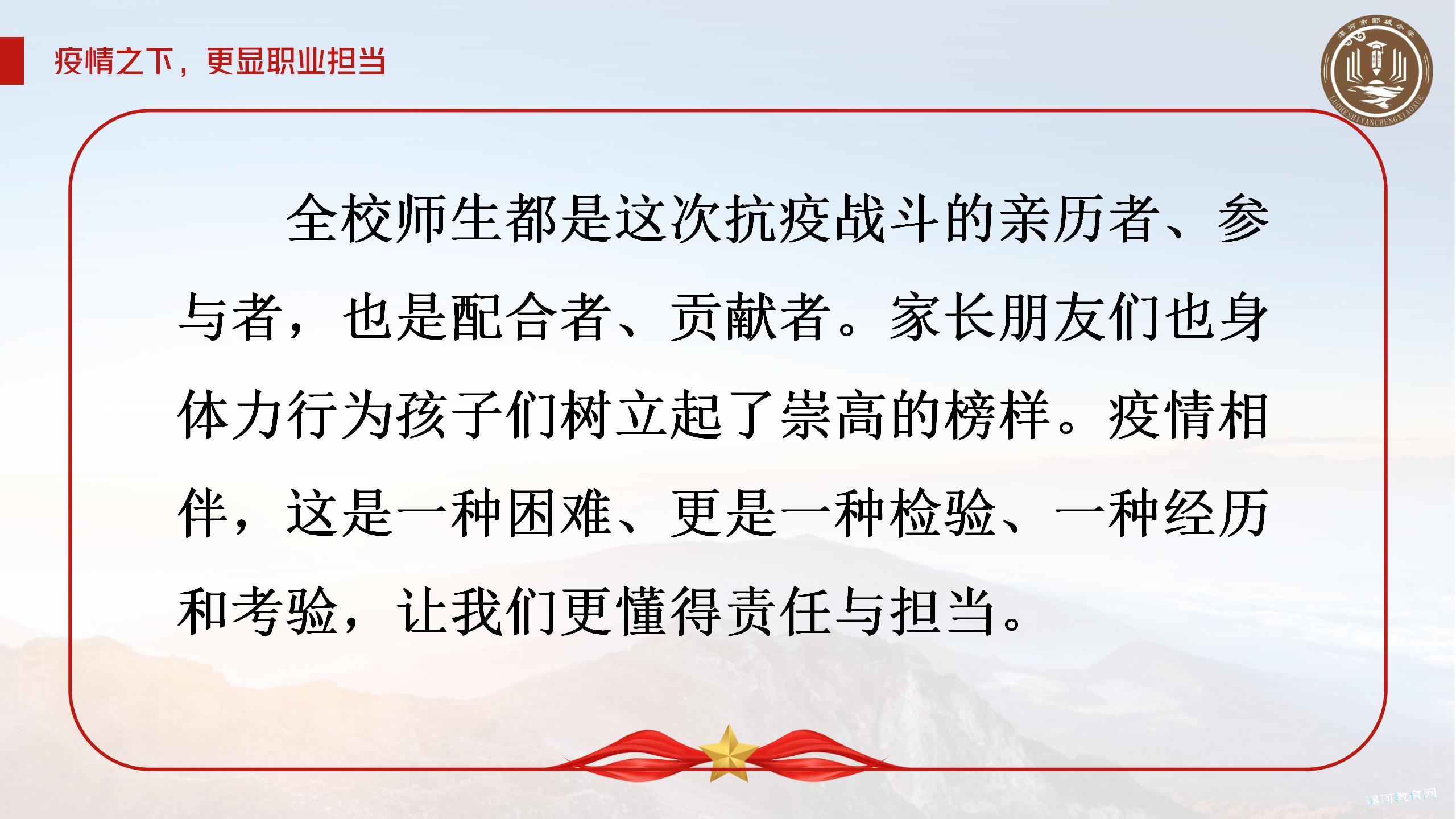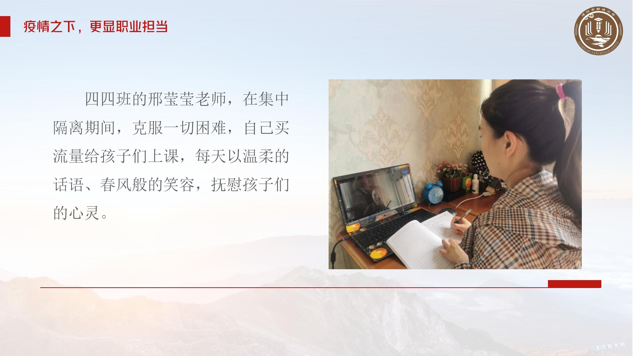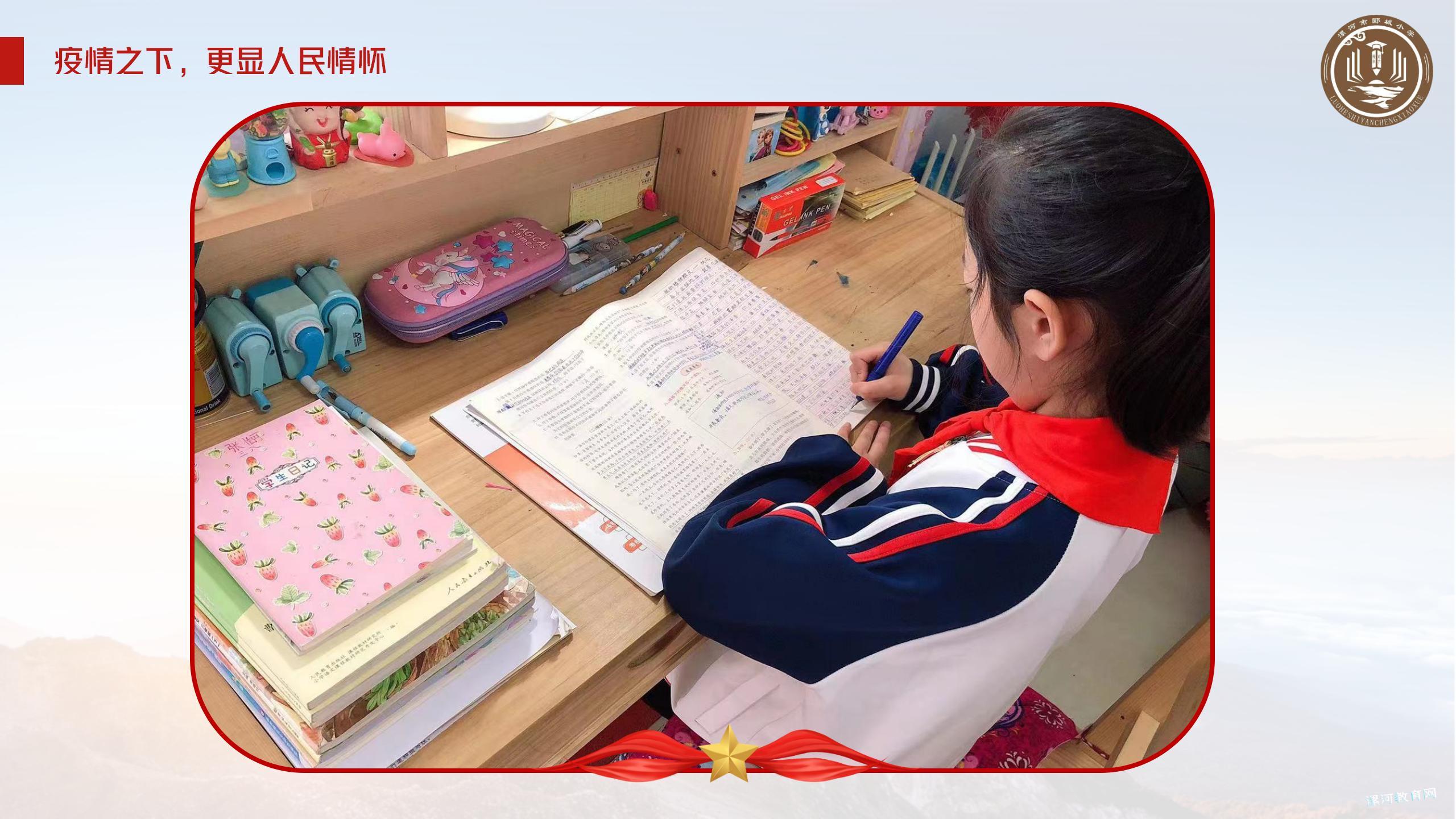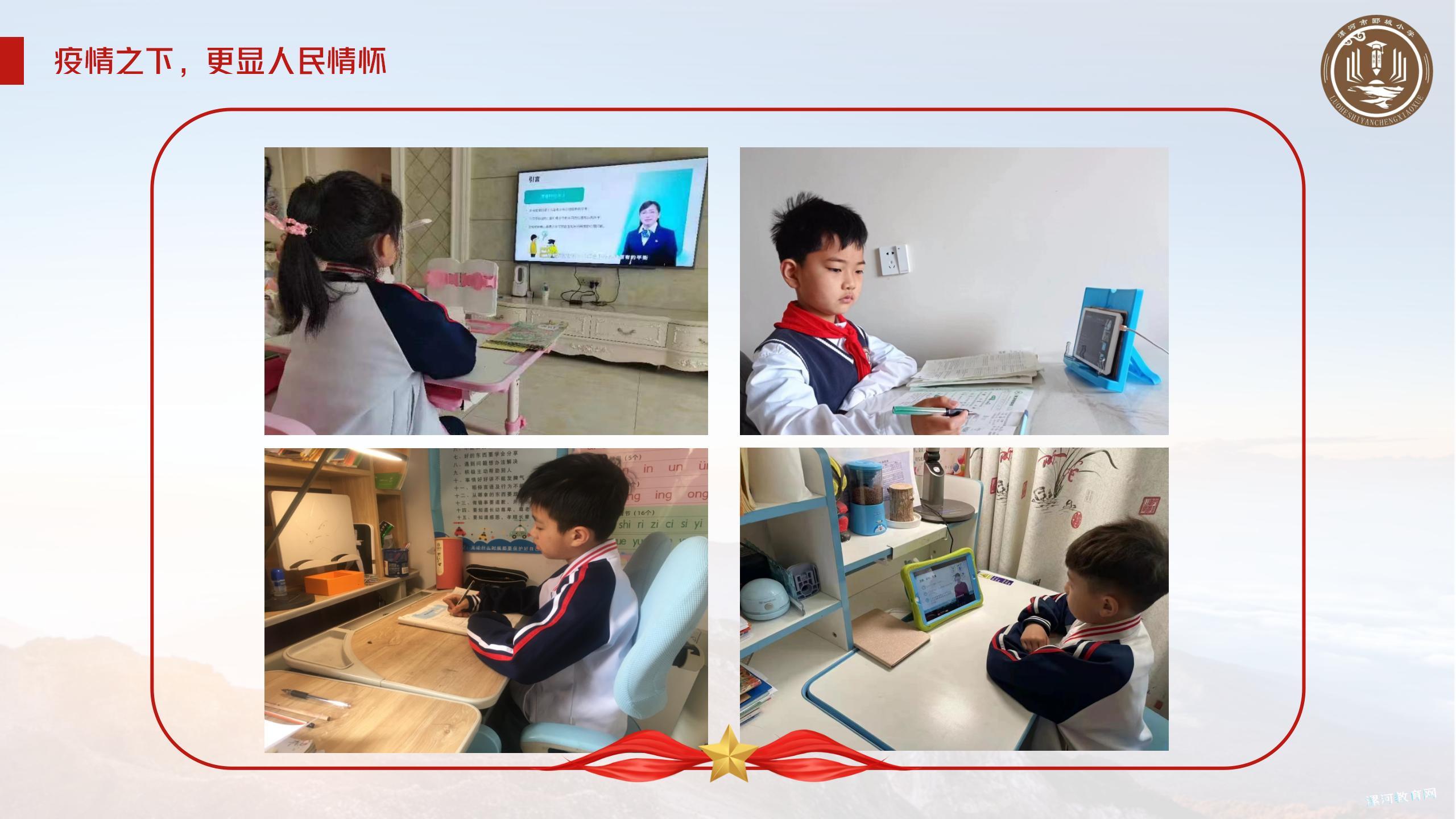 也没有分离。老师们在网络的一端传道授业解惑,把“灾难”中的点点滴滴融入教育;同学们在另一端学习汲取营养,用幼小的心灵去思考“时艰”中的温度,汲取成长的智慧力量。换一个场景,换一种方式,不变的是老师育人的初心和同学们求知若渴的心。4 月 11 日,我们学校的郑光辉主任主动请缨以校为家,24 天吃住在学校,全身心投入到疫情防控工作中,密切关注并迅速落实上级下达的各项工作要求,绝不遗漏任何一个细节。四四班的邢莹莹老师,在集中隔离期间,克服一切困难,自己买流量给孩子们上课,每天以温柔的话语、春风般的笑容,抚慰孩子们的心灵。陈琳老师为了制作学校的防疫视频,经常连续工作 10 多个小时直至深夜。学校领导班子24小时值班值守,夜以继日开展关联信息摸排,指导老师开展线上授课。全校师生都是这次抗疫战斗的亲历者、参与者,也是配合者、贡献者。家长朋友们也身体力行为孩子们树立起了崇高的榜样。疫情相伴,这是一种困难、更是一种检验、一种经历和考验,让我们更懂得责任与担当。