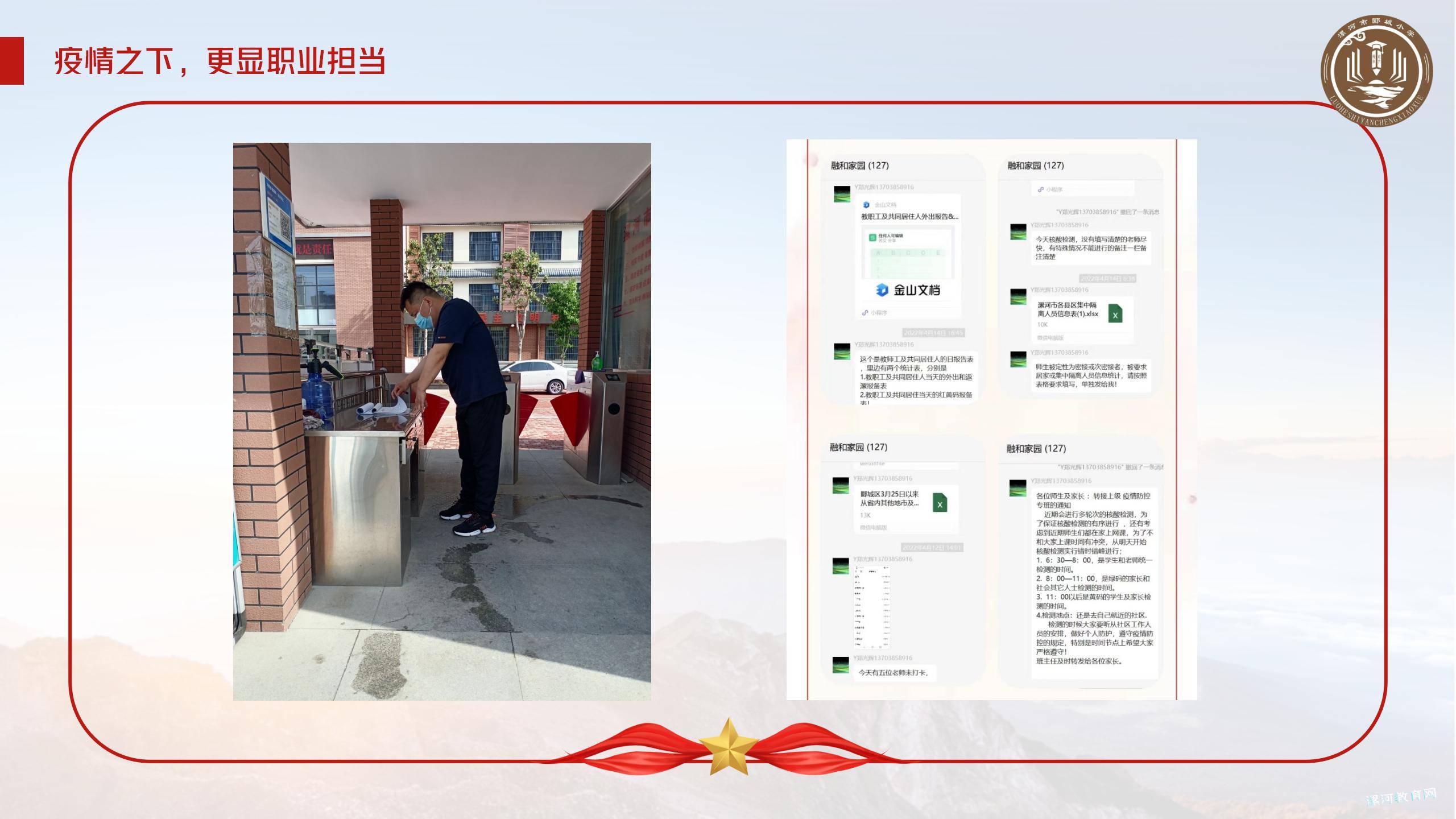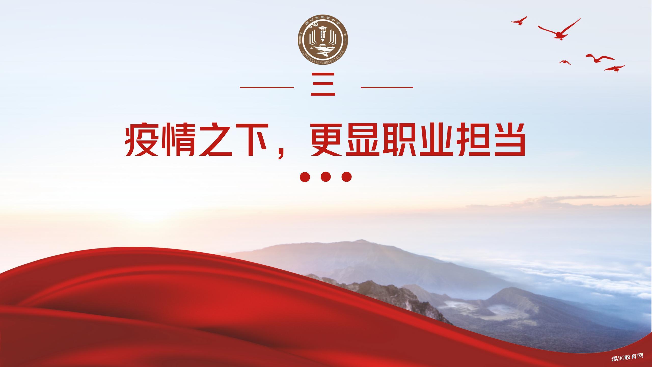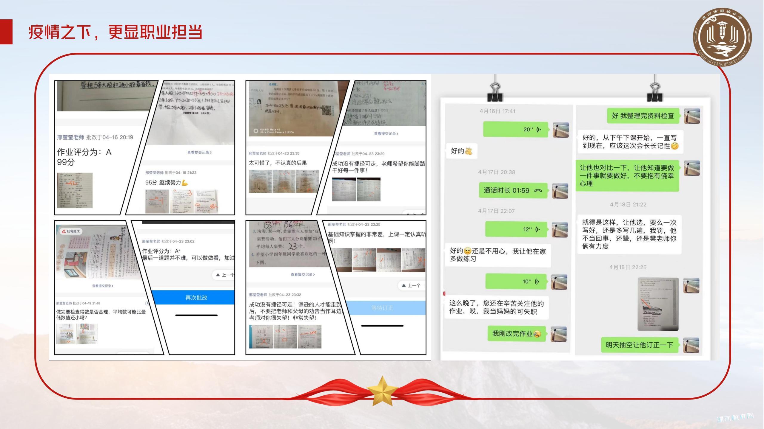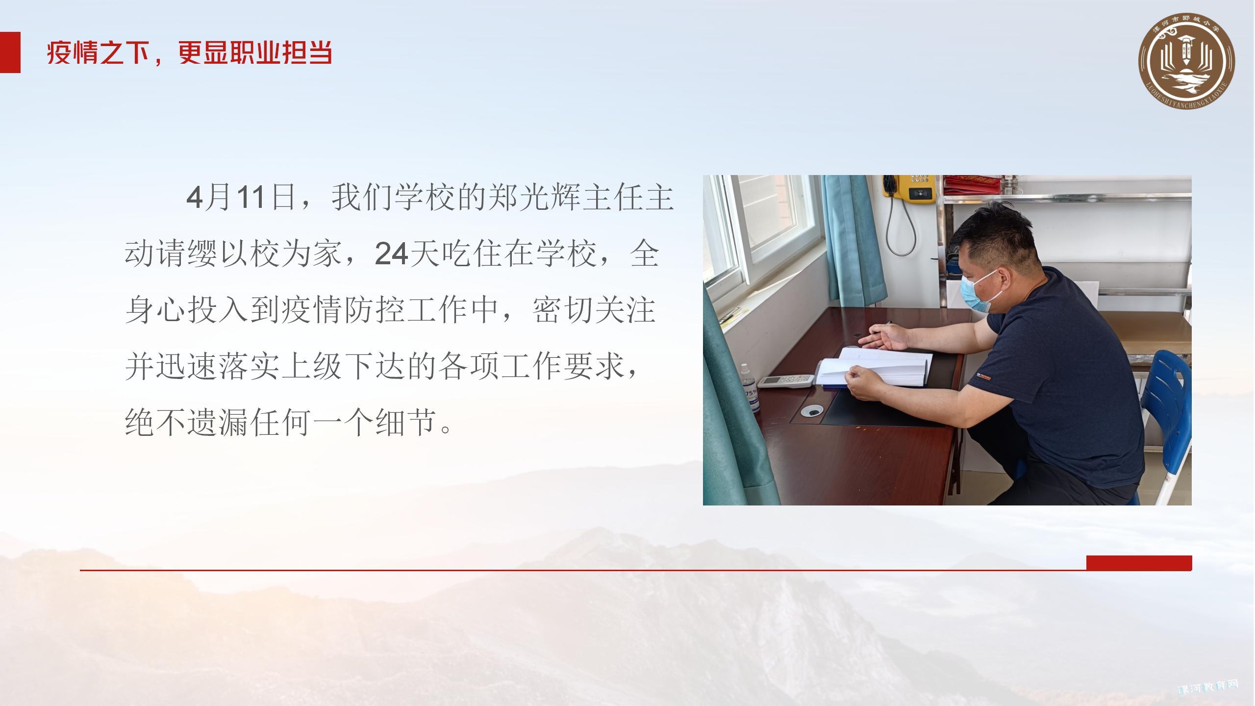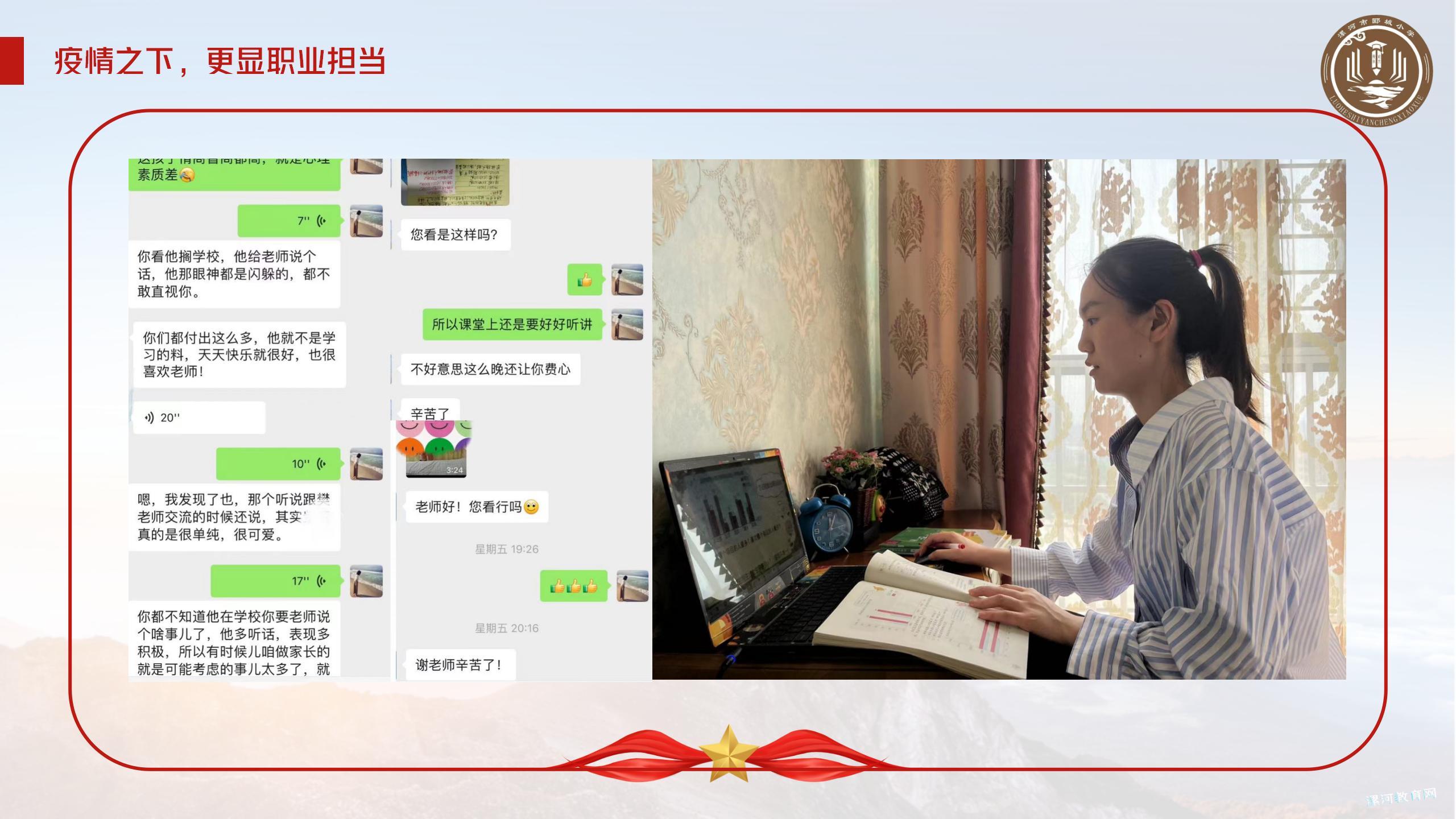 也没有分离。老师们在网络的一端传道授业解惑,把“灾难”中的点点滴滴融入教育;同学们在另一端学习汲取营养,用幼小的心灵去思考“时艰”中的温度,汲取成长的智慧力量。换一个场景,换一种方式,不变的是老师育人的初心和同学们求知若渴的心。4 月 11 日,我们学校的郑光辉主任主动请缨以校为家,24 天吃住在学校,全身心投入到疫情防控工作中,密切关注并迅速落实上级下达的各项工作要求,绝不遗漏任何一个细节。四四班的邢莹莹老师,在集中隔离期间,克服一切困难,自己买流量给孩子们上课,每天以温柔的话语、春风般的笑容,抚慰孩子们的心灵。陈琳老师为了制作学校的防疫视频,经常连续工作 10 多个小时直至深夜。学校领导班子24小时值班值守,夜以继日开展关联信息摸排,指导老师开展线上授课。全校师生都是这次抗疫战斗的亲历者、参与者,也是配合者、贡献者。家长朋友们也身体力行为孩子们树立起了崇高的榜样。疫情相伴,这是一种困难、更是一种检验、一种经历和考验,让我们更懂得责任与担当。