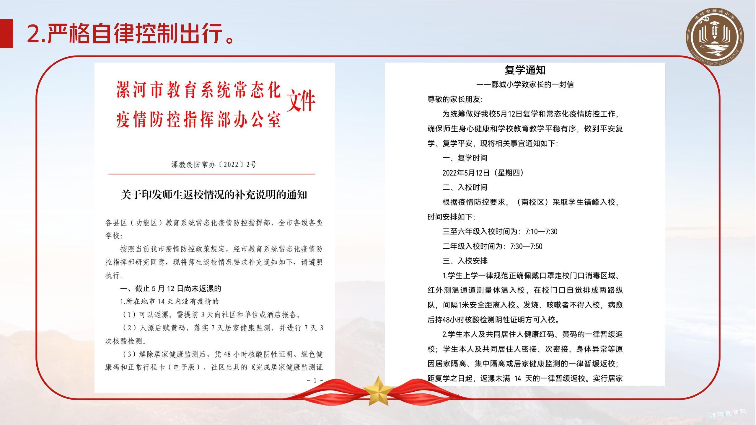 2.严格自律控制出行。自今日起,实行校园相对封闭管理,学校倡导“非必须,不外出”。如必须外出,家长需提前规划好出行路线和出行方式,并以网络表格方式向老师、学校报告,经批准后方可外出,返回后及时报告并填报所有事关疫情防控信息。