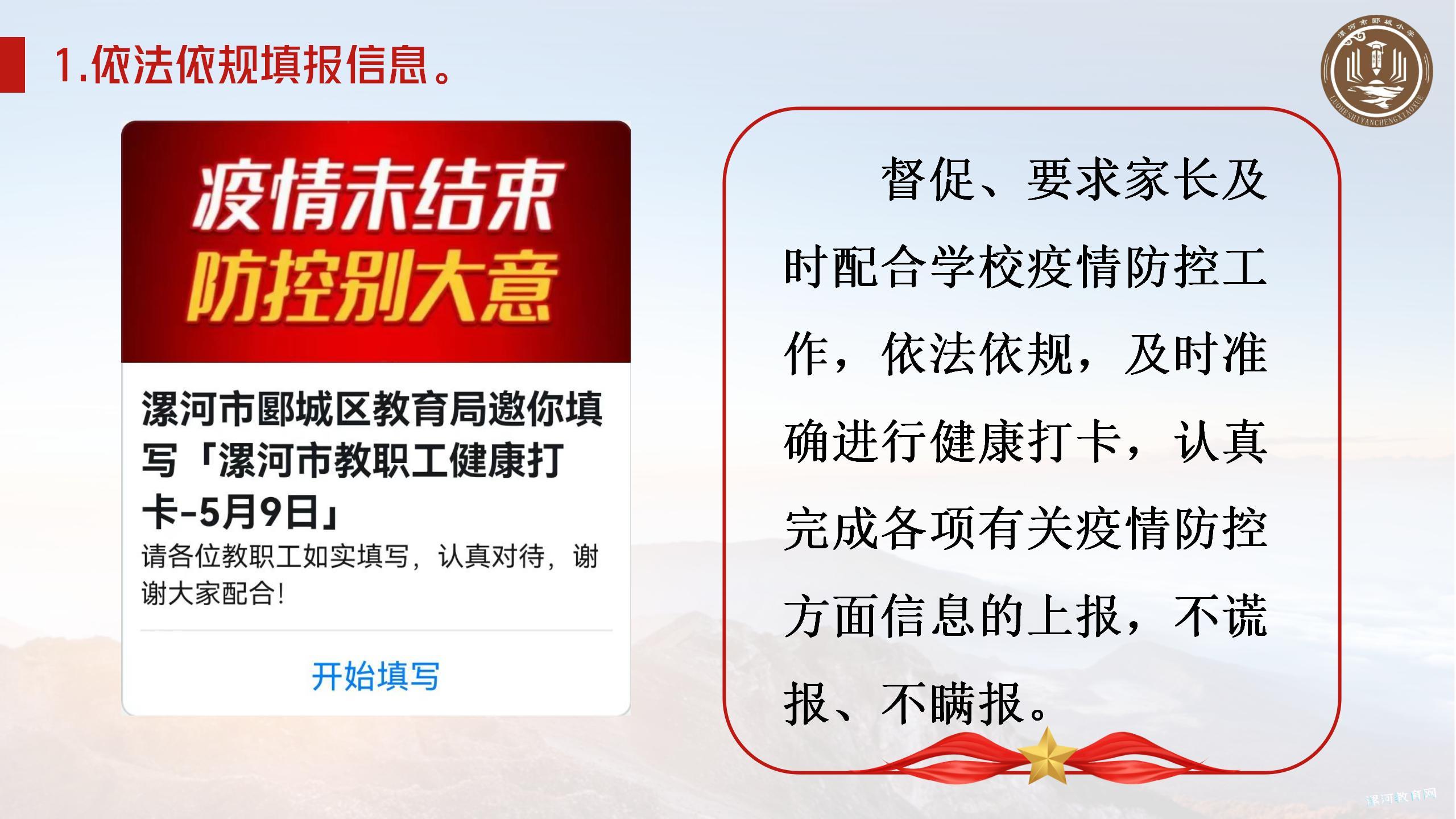1.依法依规填报信息。督促、要求家长及时配合学校疫情防控工作,依法依规,及时准确进行健康打卡,认真完成各项有关疫情防控方面信息的上报,不谎报、不瞒报。
