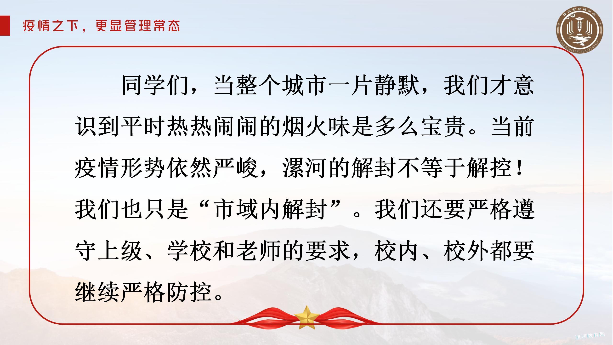 同学们,当整个城市一片静默,我们才意识到平时热热闹闹的烟火味是多么宝贵。当前疫情形势依然严峻,漯河的解封不等于解控!我们也只是“市域内解封”。我们还要严格遵守上级、学校和老师的要求,校内、校外都要继续严格防控。