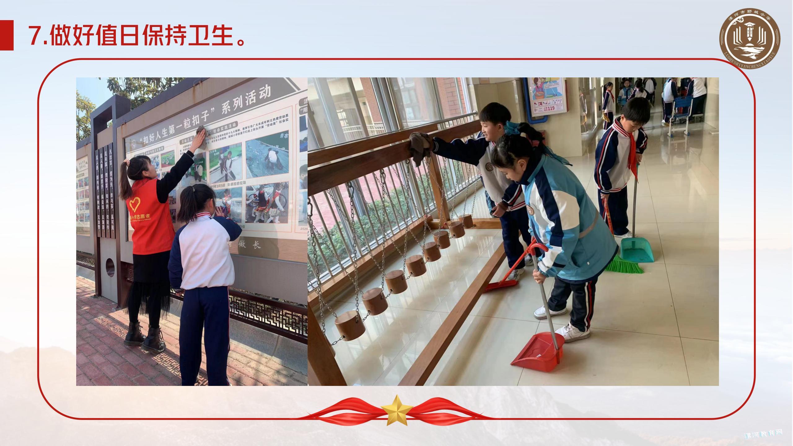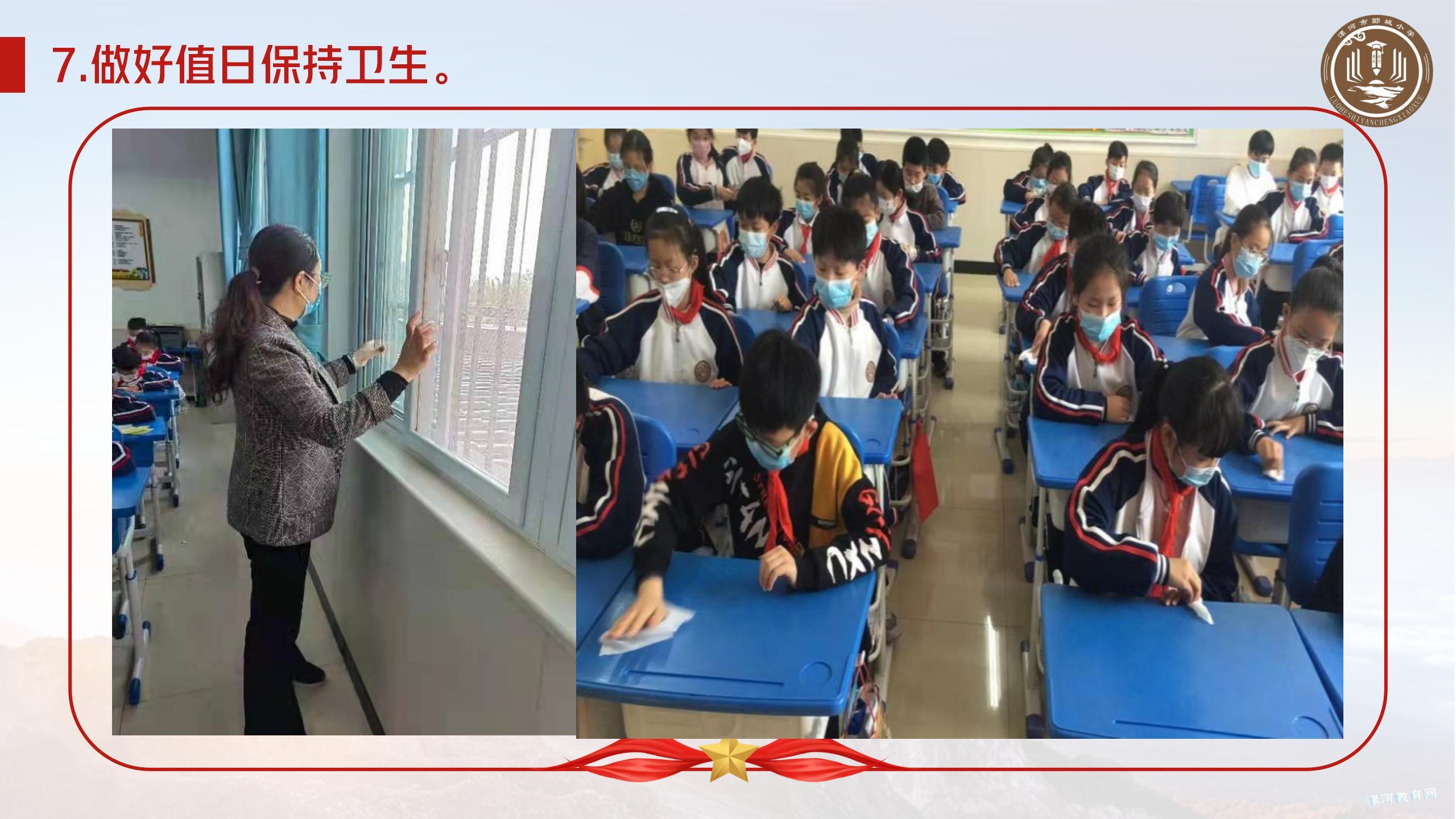 7.做好值日保持卫生。认真做好教室值日,及时清理垃圾,保持教室卫生清洁,勤开窗通风(天气晴好的情况下全天候通风)。每天中午用消毒湿巾进行桌面清洁消毒。