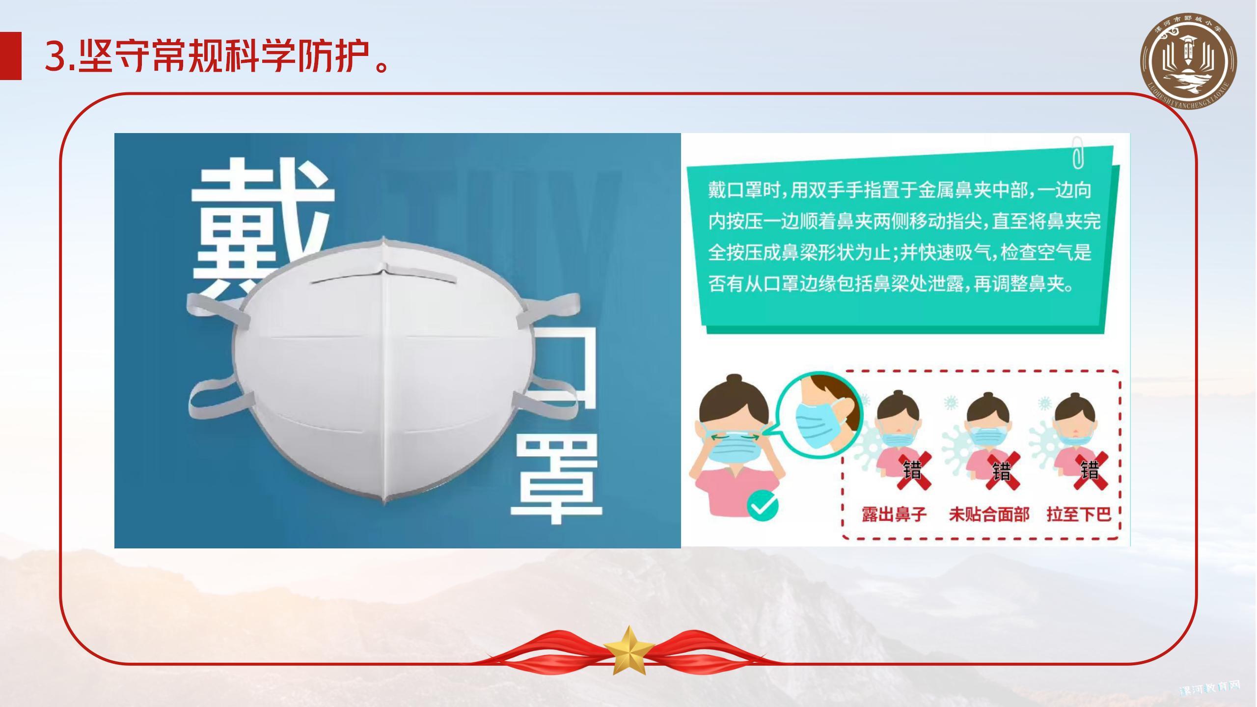 3.坚守常规科学防护。坚持正确佩戴口罩,不随地吐痰,打喷嚏或咳嗽时用纸巾、屈肘捂住口鼻,并及时对手部进行清洁。使用后的口罩不乱丢,折叠缠绕后,放入黄色医用废物桶内。