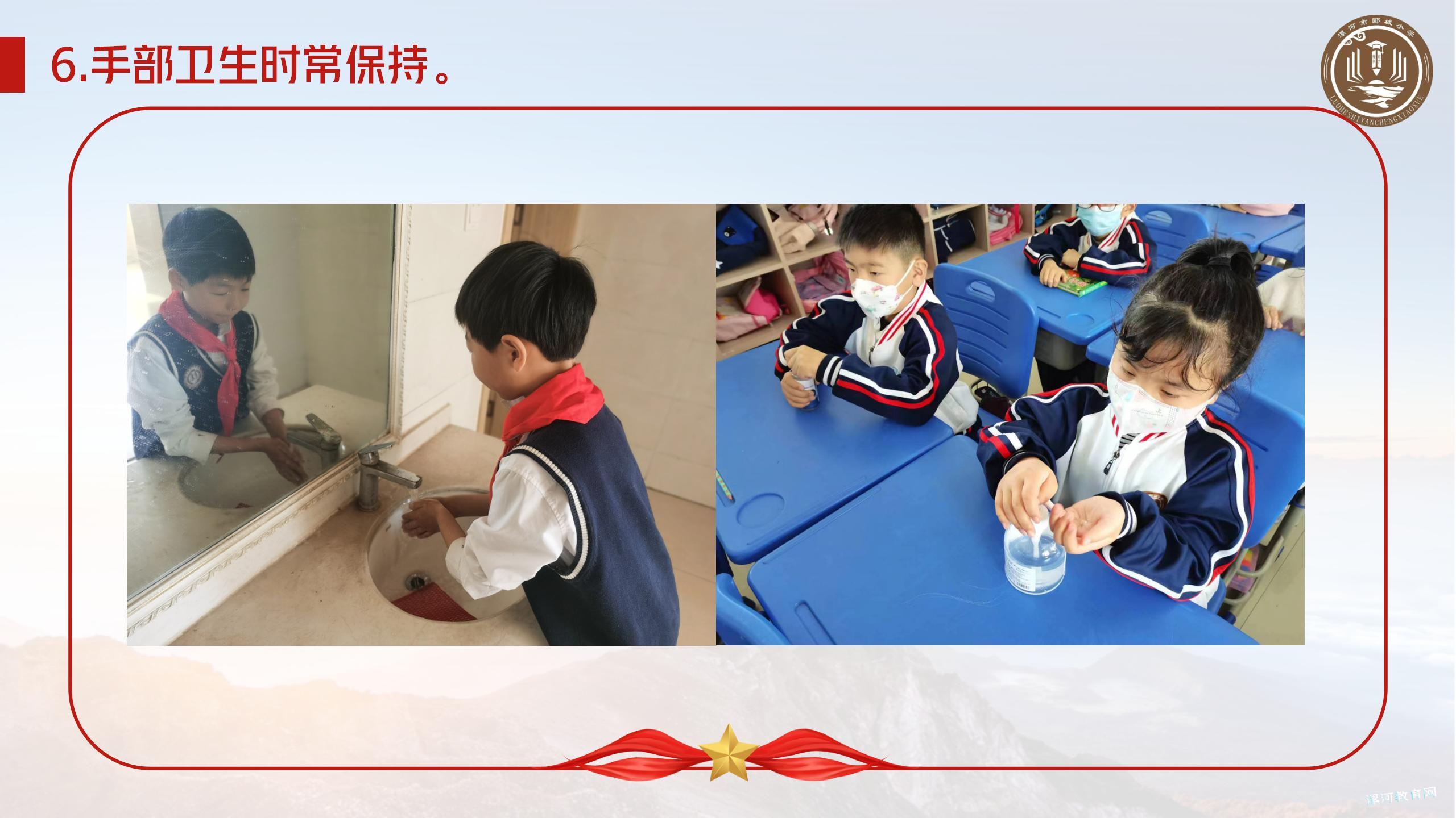6.手部卫生时常保持。保持双手卫生是预防疾病传播的重要手段。每节下课后如厕和室外游戏后,都要做到勤洗手,随时保持手部卫生。做好个人卫生,勤洗澡、勤换衣,勤整理书包、书桌。