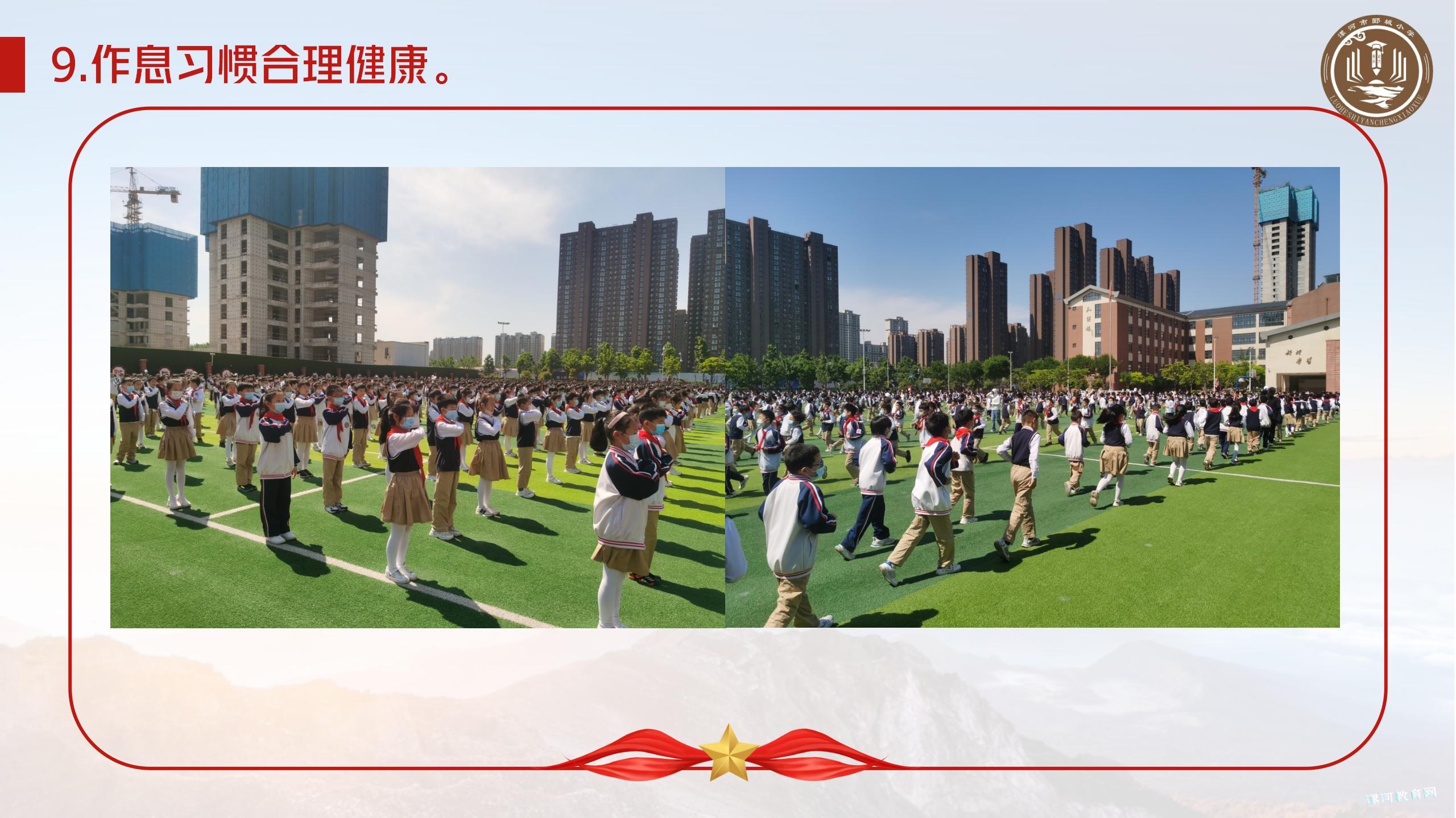 9.作息习惯合理健康。早睡早起,每天坚持良好的作息习惯,提升免疫力。积极参加各种体育活动,每天保证活动一小时,提高自身抵抗力。