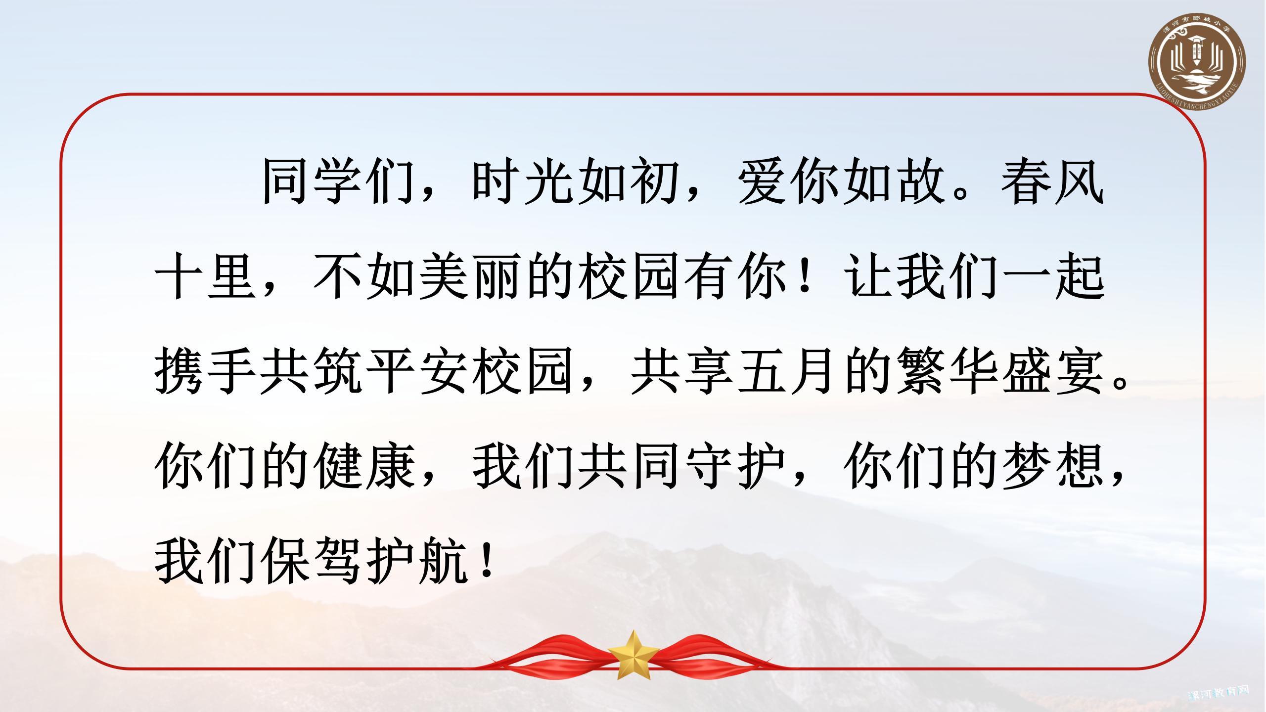 同学们,时光如初,爱你如故。春风十里,不如美丽的校园有你!让我们一起携手共筑平安校园,共享五月的繁华盛宴。你们的健康,我们共同守护,你们的梦想,我们保驾护航!
