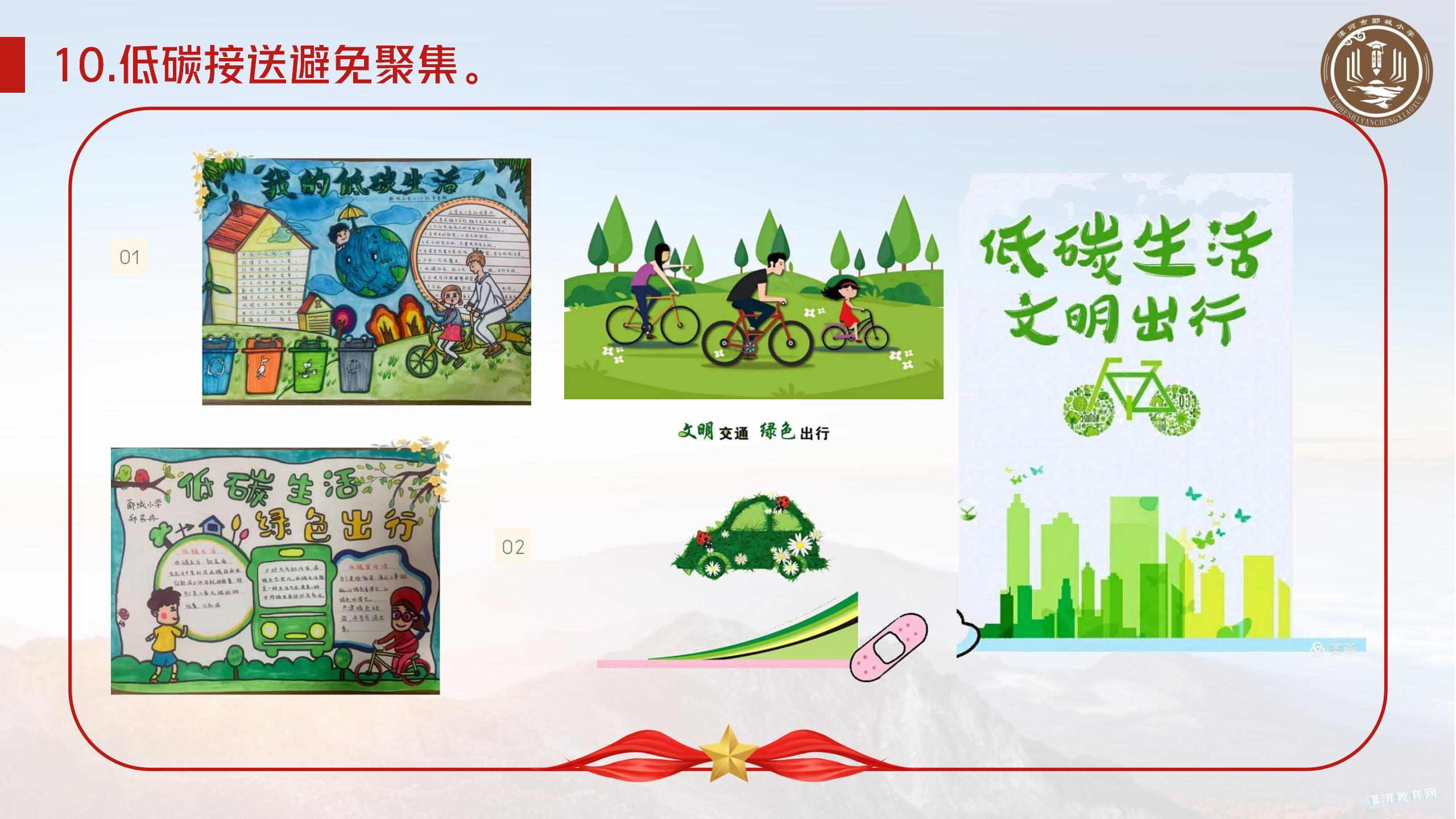 10.低碳接送避免聚集。不去人员密集的公共场所。上下学时尽量避免公共交通方式,推荐步行、骑车(自行车、电动车)等低碳环保出行方式接送。等候入校、等候接回时不聚集不扎堆儿,正确佩戴口罩,自觉保持一米安全距离。
