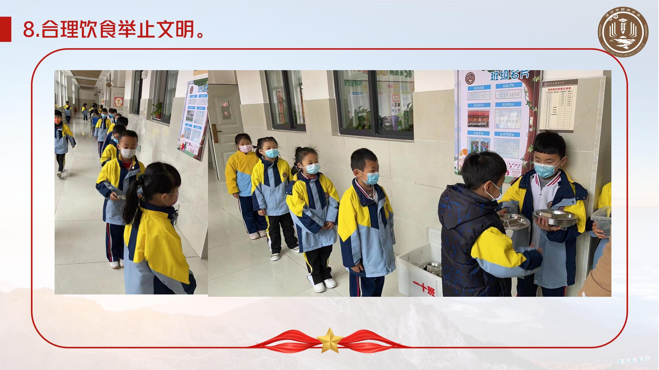8.合理饮食举止文明。中午就餐时严格按照学校的就餐要求执行,举止文明,盛餐、放餐具时必须间隔1米距离;老师分餐时需要戴一次性手套、一次性工作帽、口罩,穿工作服。午餐结束以后,各班餐具放回收纳箱,整齐摆放在班级门口,由各楼层的技能组负责老师统一收回。