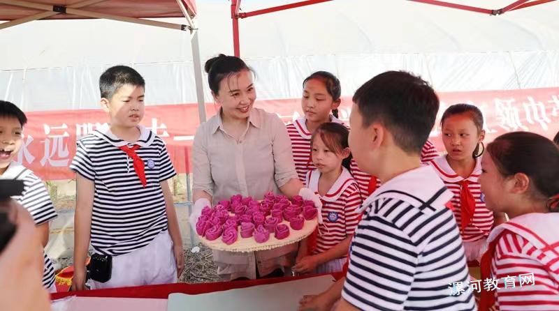 采摘环节,少先队员们根据提示,把手伸到果实下轻轻地转动着,小心翼翼地采摘下来,收获了满满一篮。他们还充分利用火龙果烘干箱、破壁机、蒸锅”等小帮手,在思政老师宋亚凤的指导下制作火龙果花样馒头。辛勤劳动后,同学们端出了自己制作的精致“花束”、火龙果汁等美食,自豪感油然而生。