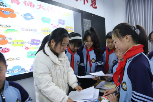 在欢声笑语中,孩子们根据老师的要求用标准的普通话流利背诵,一气呵成,展示了自己的学习成果。在“生生测评”中,高年级的小考官和低年级的小朋友都收获了自信、成长与快乐!