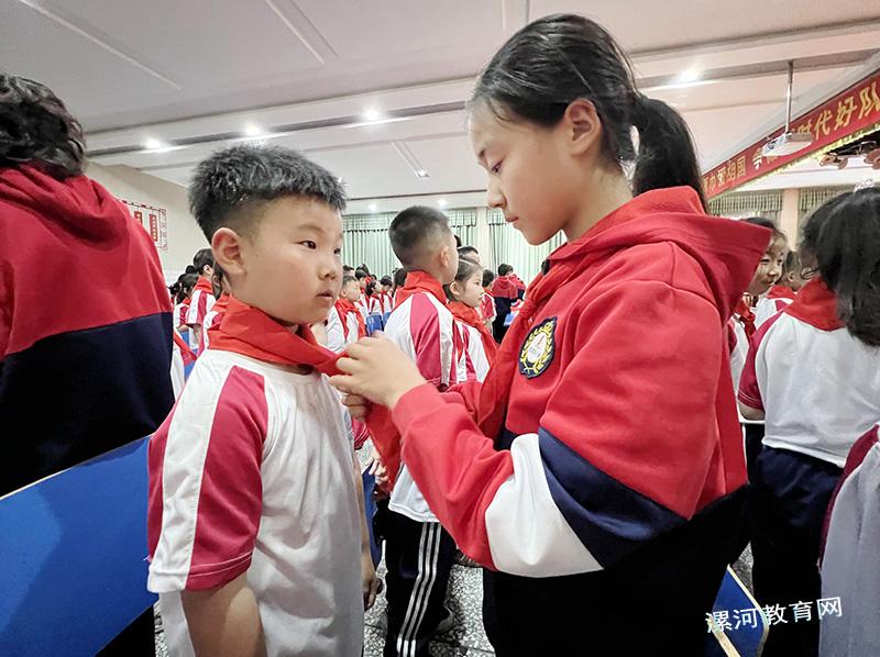 红领巾是骄傲、是传承、是希望。老队员郑重地为新队员佩戴红领巾,这是仪式的表达,更是老队员向新队员传递少先队员优良传统和光荣使命的时刻。新老队员互敬队礼,星星火炬代代相传。