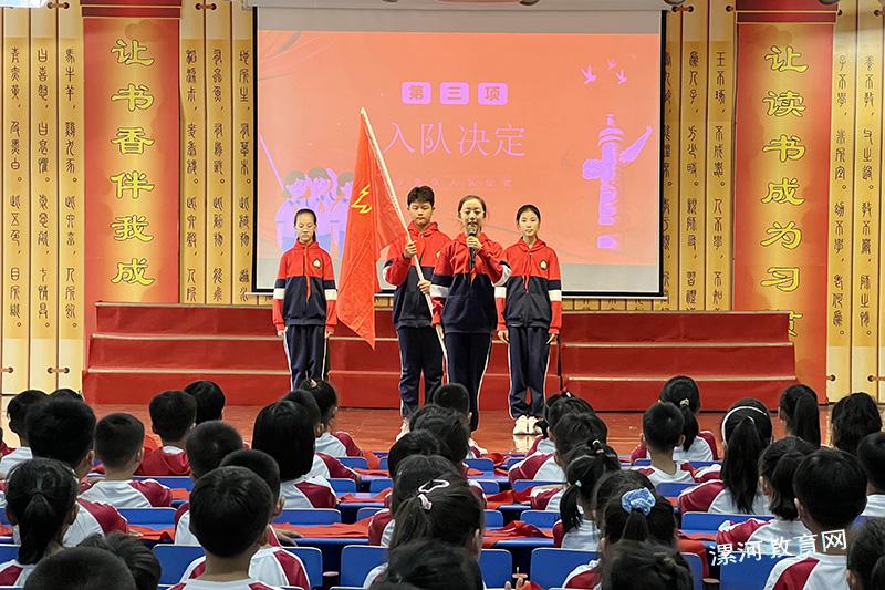 伴着激昂的出旗曲旋律,入队仪式拉开了序幕。全体队员庄严肃立,向队旗敬礼,高唱《中国少年先锋队队歌》,嘹亮的歌声传递出少先队员热爱党、热爱祖国、热爱人民的情感。